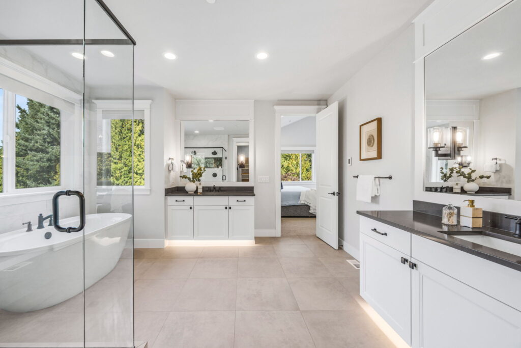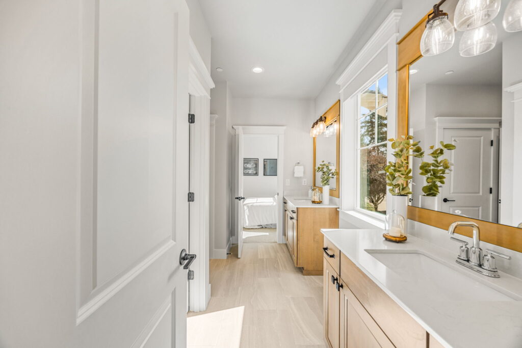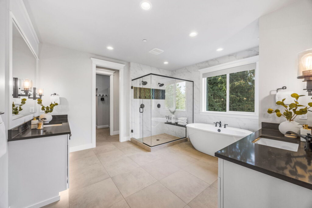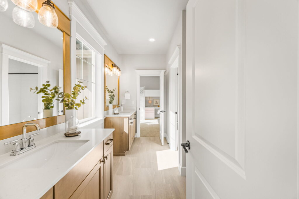 - Spa-inspired primary baths, heated tile floors, and undercabinet lighting